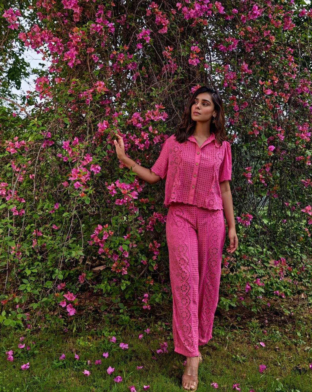 Are you ready to make a bold statement? Embrace vibrant style with our "Flamingo Set". Made from hot pink schiffli fabric, this set exudes playful charm. The intricate schiffli embroidery adds an artistic touch, while the relaxed fit ensures comfort on casual days. The coordinating pants and shirt create a stunning co-ord set that effortlessly combines style and comfort. Whether you're heading to a brunch or a day out with friends, the Flamingo Set will make you stand out wherever you go.