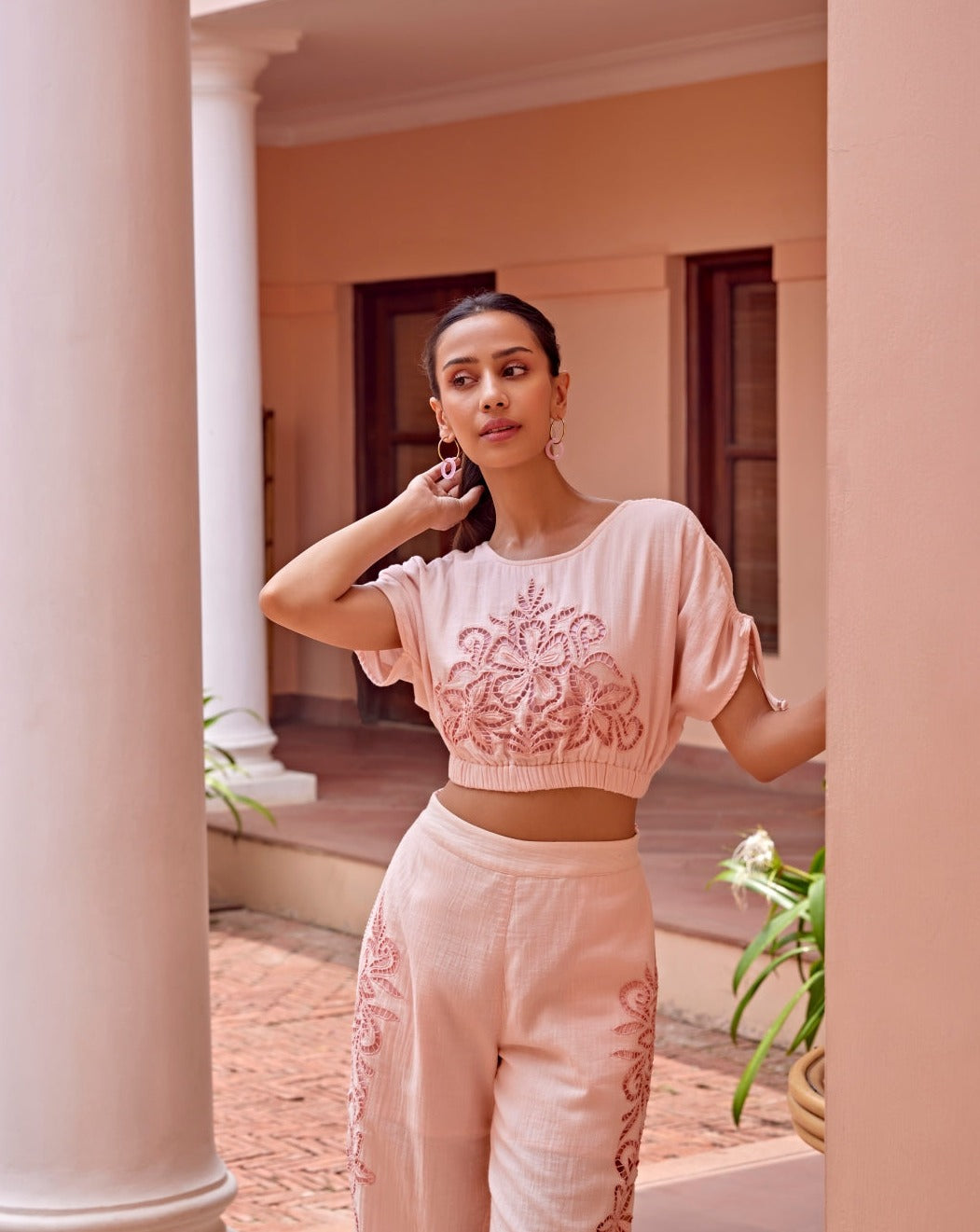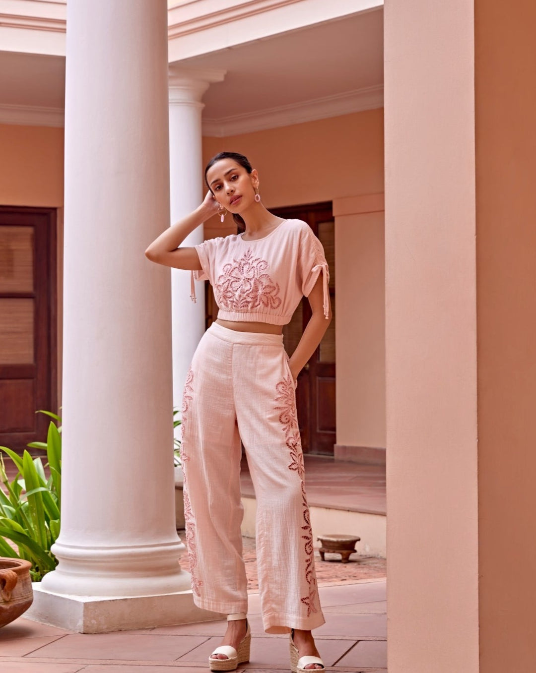 Indulge in the epitome of feminine charm with our "Pink Blossom Set". Crafted from a super comfortable and soft double gauze fabric, this loose-fitting baby pink top drapes effortlessly and offers a luxurious feel. The flattering silhouette of the co-ord enhances your figure, while the delicate cutwork embroidery adds an exquisite touch. The Pink Blossom Set combines comfort, elegance, and a hint of whimsical romance, making it a delightful addition to your wardrobe.
