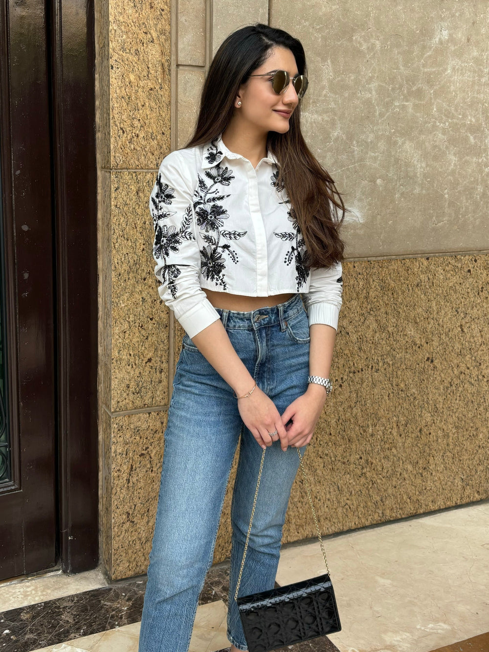 Introducing the Lauren Embellished Shirt – a chic and versatile addition to your wardrobe. This white shirt boasts a cropped length with hand-beaded, black sequin embroidery that adds a touch of elegance. The cool button-down style makes it the perfect piece to embrace understated sophistication.