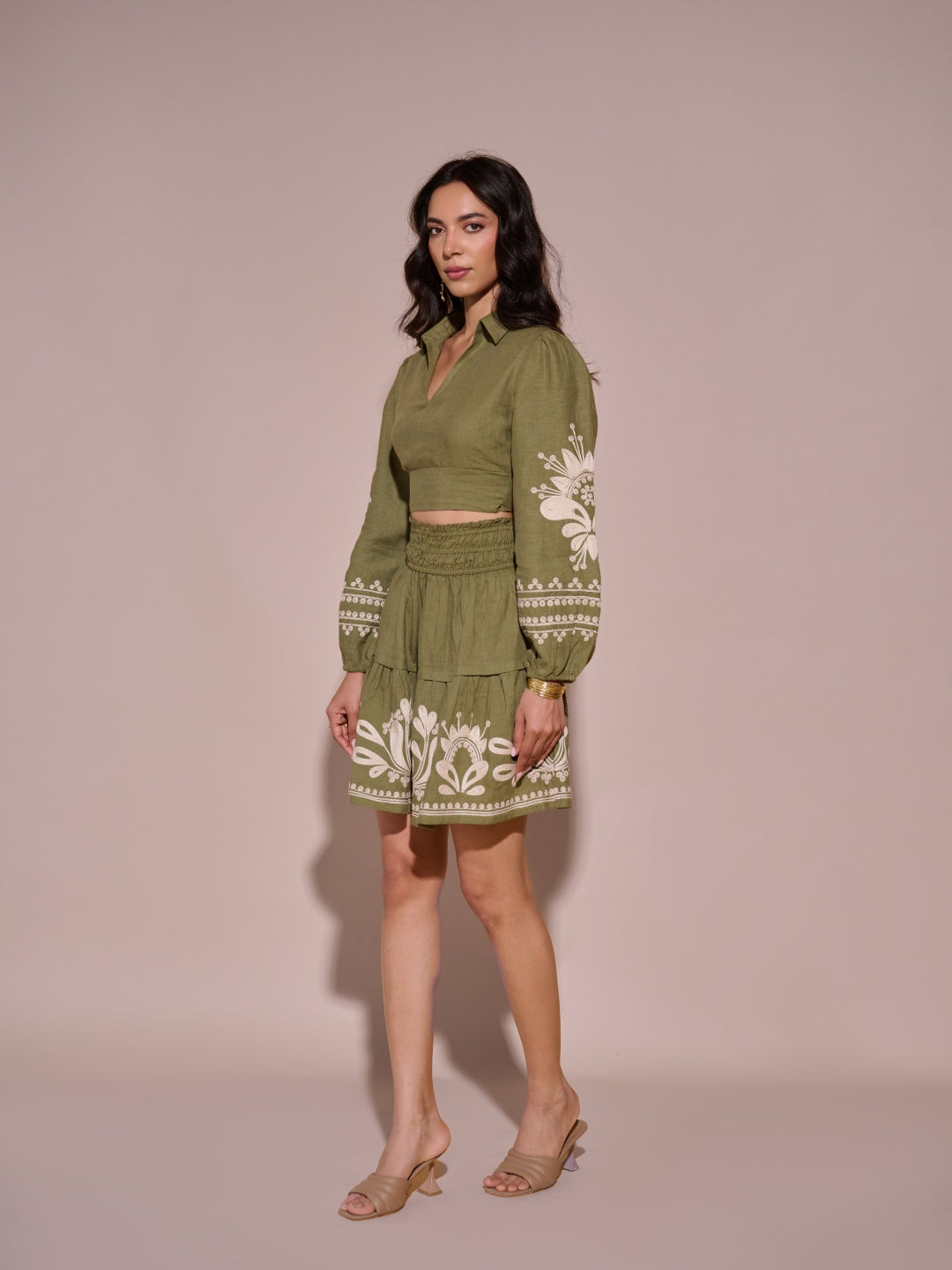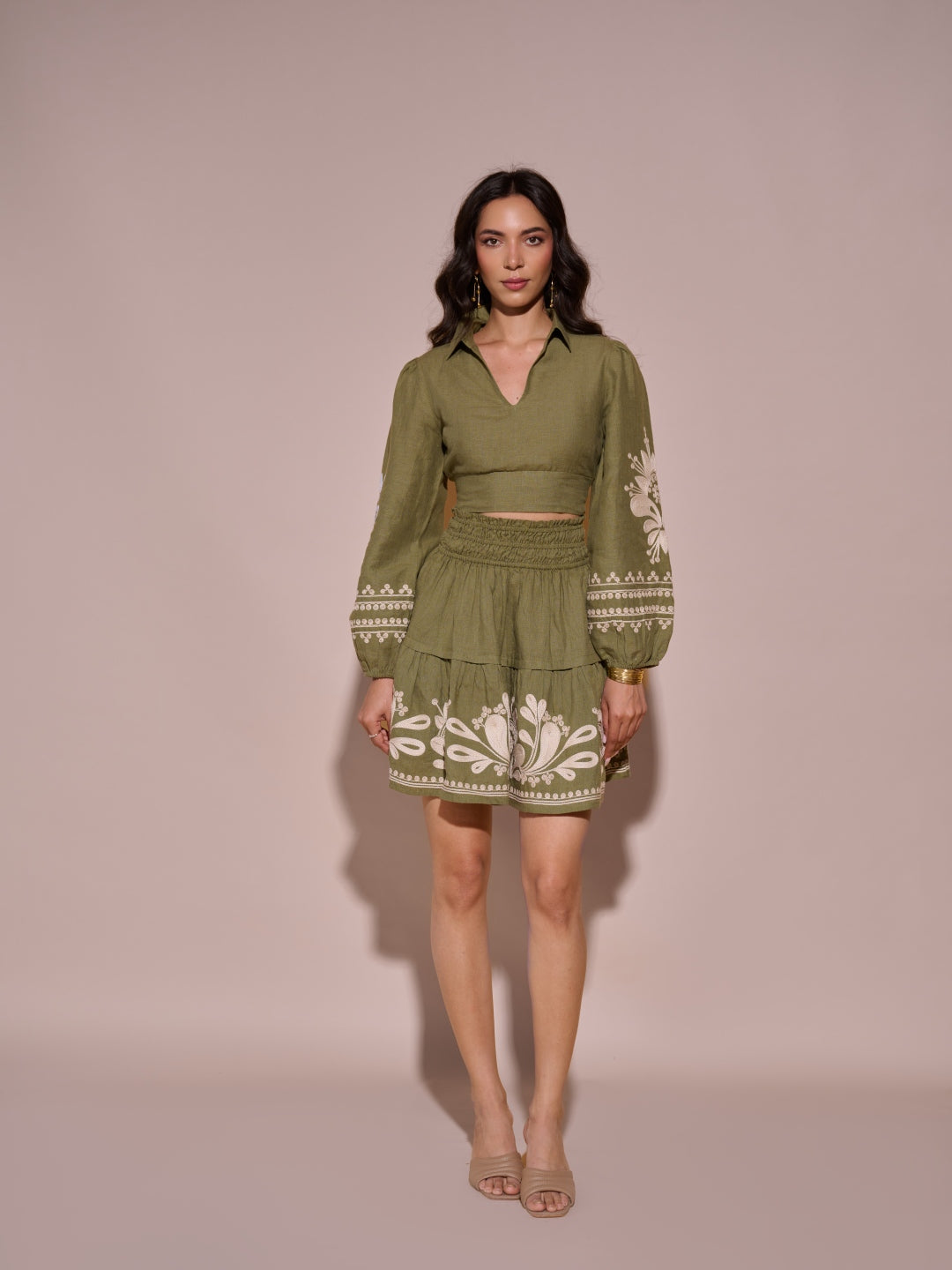Crafted from 100% linen in an olive hue, the Charlotte Linen Top features a cropped silhouette with an elasticated waist for a great fit, embroidered sleeves, and a stylish tie-back detail. Lightweight and breathable, it’s ideal for day outings, vacations, and brunches — comfortable, chic, and effortlessly put-together.