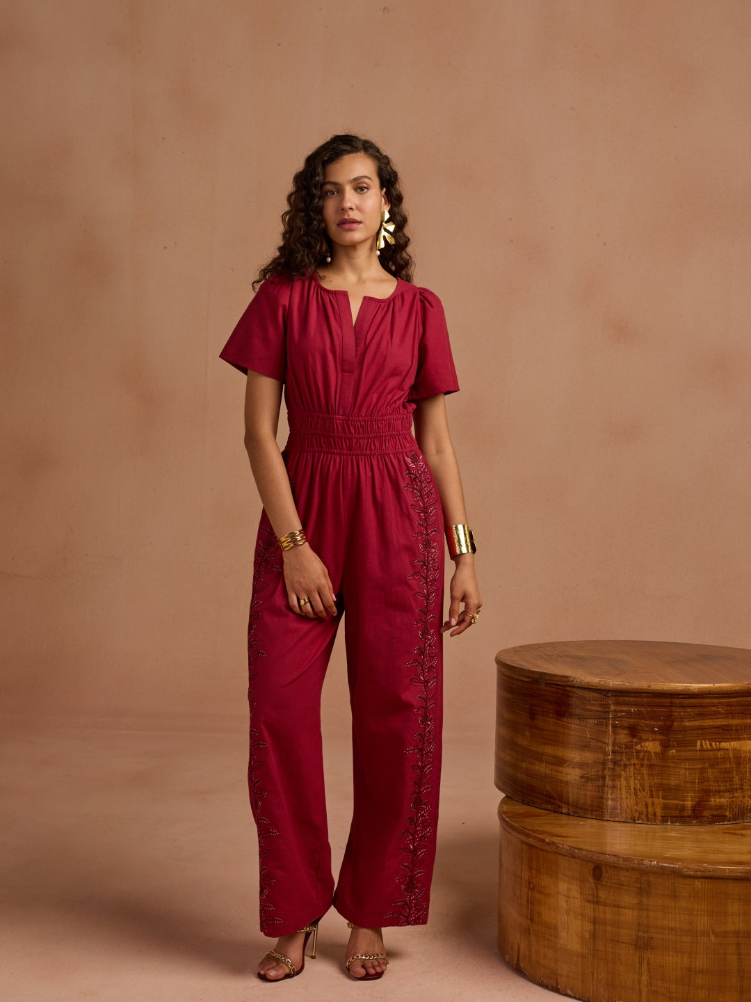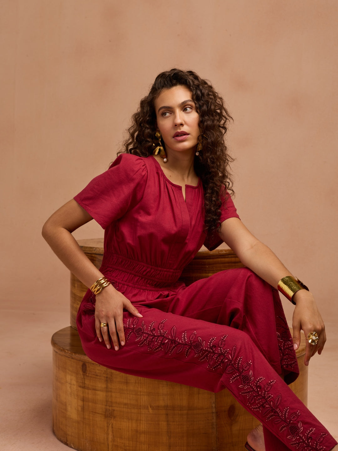 The Khloe Embroidered Jumpsuit comes in a red hue, crafted from a breathable cotton-linen blend that ensures all-day comfort and an airy, natural feel. Featuring a cinched waist with smocking for a flattering fit, soft cap sleeves, and delicately embroidered pants, it strikes the perfect balance between relaxed elegance and refined detail. Ideal for brunches, travel days, or casual evenings out, this jumpsuit is your go-to for easy, elevated dressing.