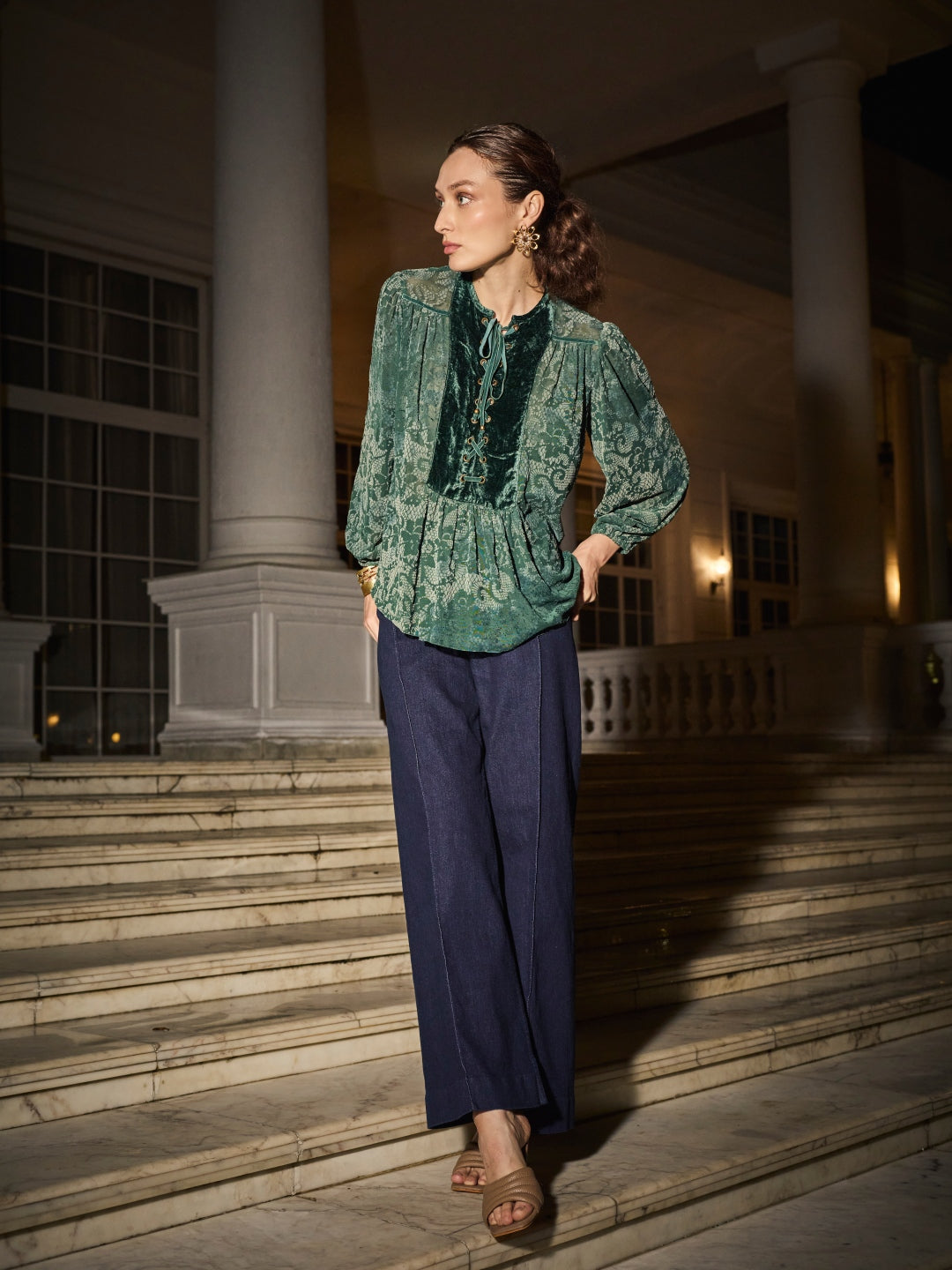 The Aria Burnt-Velvet Top is crafted from plush burnt-velvet fabric that catches the light with a rich, luminous texture. The yoke features delicate velvet lace detailing with a tie-up, adding a soft, feminine touch to its minimalist silhouette. Perfect for evening wear, it pairs beautifully with tailored trousers or flowing skirts for a look that’s effortlessly refined.