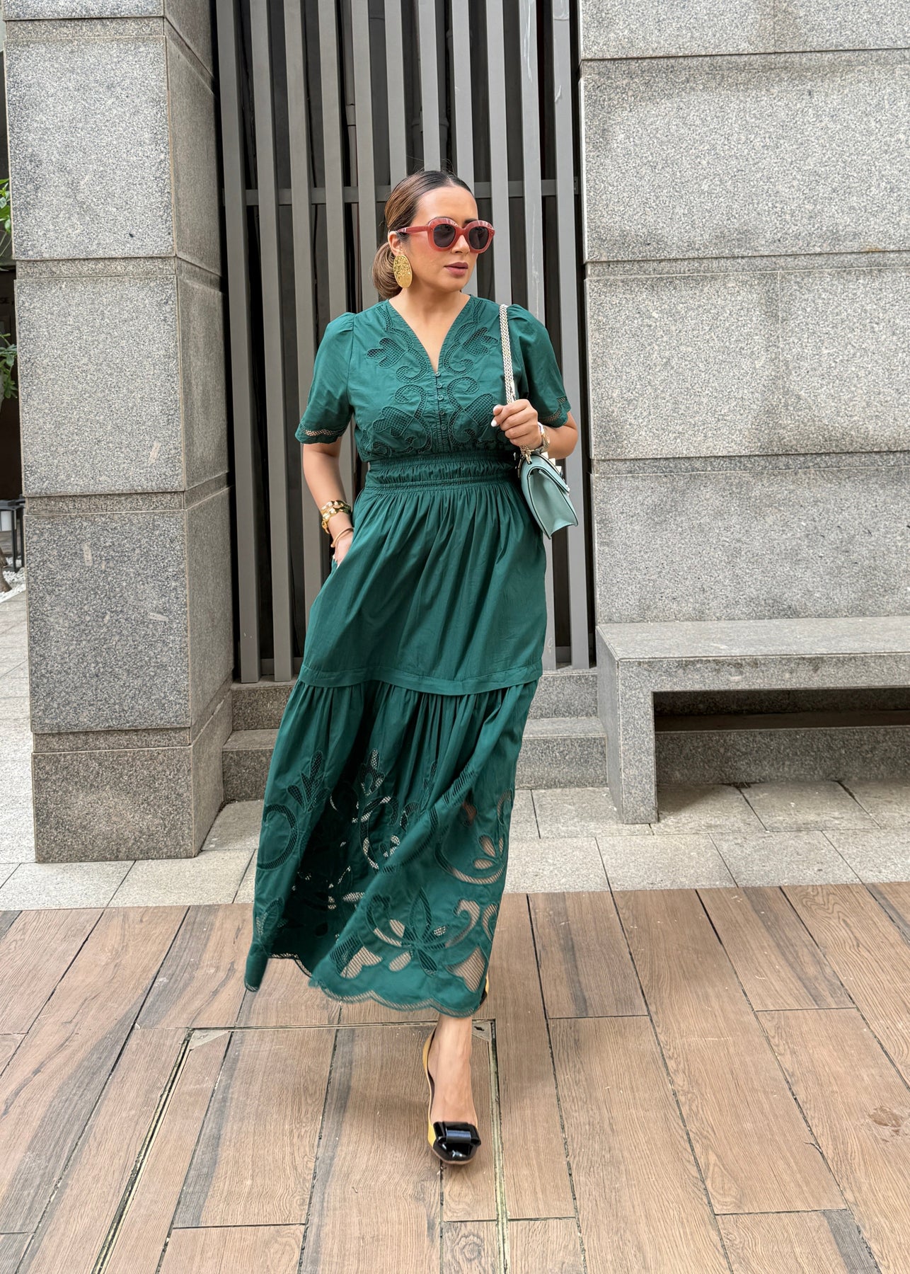 Introducing the Ava Dress, a captivating maxi-length piece that blends effortless elegance with everyday versatility. Crafted in a refreshing green hue, it features exquisite cutwork embroidery on the hem and yoke, adding a delicate, detailed touch. The smocked waist ensures a flattering fit while keeping the look comfortable and easy to wear. Perfect for brunches, getaways, or breezy evenings, this dress is your go-to for chic summer dressing.